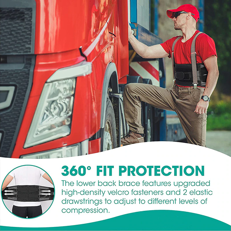 Lower Back Support Our Back brace contains 4 Memory-aluminum stays that are quadruple harder than the commonly used PP strips, and 2 steel springs placed along the waist side, offer 360° stronger vertical support to lower back, prevent excessive rolling of your muscles and decrease the pressure on your discs. Design The back support is made of 4-way stretch elastic material,3D knitting technology by different compression levels, for superior fit, breath and comfort. The inner layer is made of velvet fabric, giving an ultimate baby-skin-like silky touch, perfect for dressing internally. Preventative Back support with 2 elastic straps are designed to add extra compression around the lower back to prevent back injuries from weight lifting, long standing or sitting, doing housework, working, etc. Relief waist muscles ache, disc herniation, sciatica, scoliosis etc when wearing the back belt. 2 Silicone anti-skid bands are designed on the 2 sides of the waist, prevent the waist support belt from rolling up when sitting, bending or doing other activities. The 1.5'' * 3.7'' wide size Touch Fasteners of 2 elastic straps provides strong adhesion far beyond your expectations, made of PVC material that is usually used for babies clothes, will not scratch your skin or damage your clothes. Package includes: