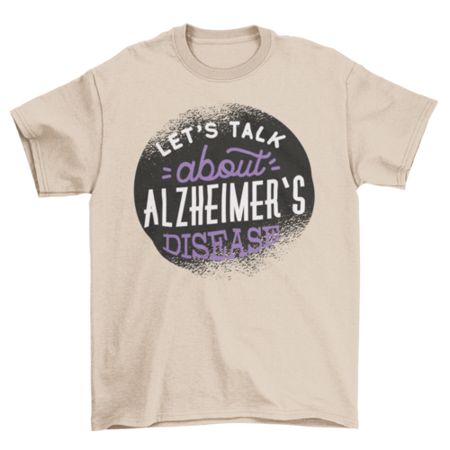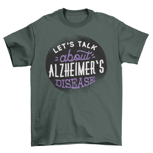Alzheimer awareness lettering t-shirt design featuring "Let's talk about Alzheimer disease" statement in white and purple with different font styles.